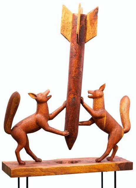 The exhibition explores human relationship with the inevitable change ahead. The sculptures depict various totemic animals and birds coming in contact with air bombs, rockets and mines. Bombs and other combat equipment symbolize the force of change that exists in any situation or structure from the beginning of its existence. The relationships and insecurities that form based on refusal to accept imminent change, underlie the existence of modern global militarism. Deliberate cultivation of fear and mutual distrust in transnational politics, inviting the public to spend on military needs all around the world, is an evident reality.