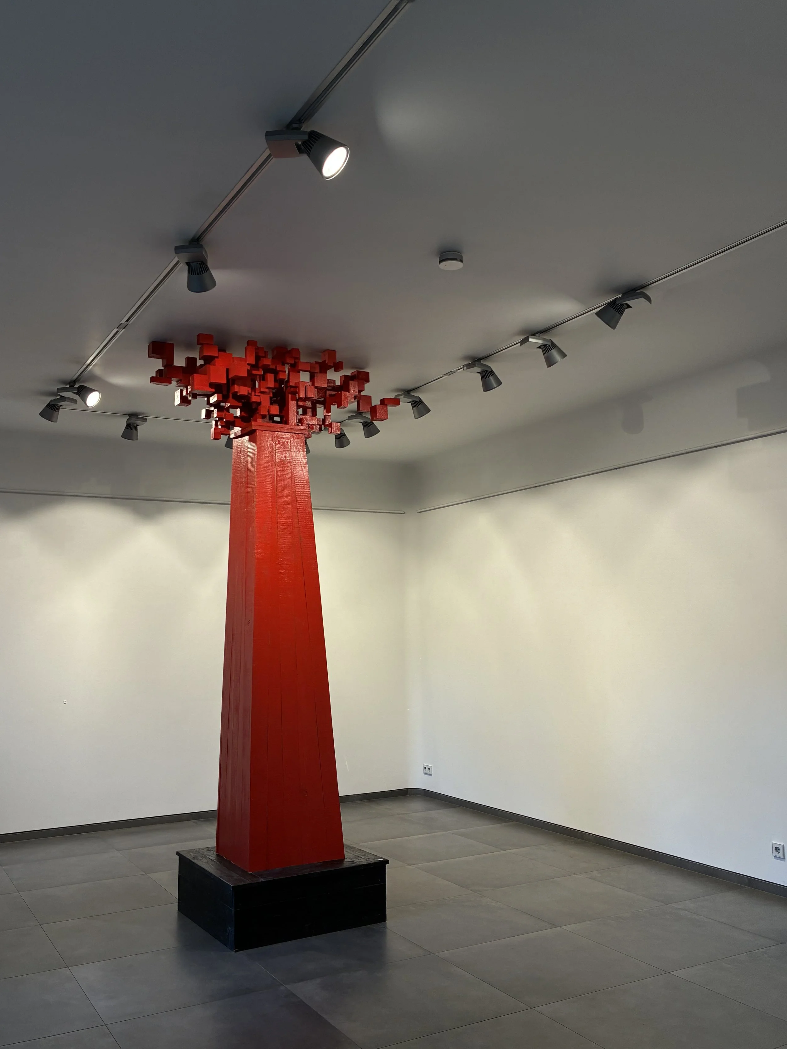 Living in today's world, artists have access to many means of expression and different ways of talking about what is important. The works on display in the exhibition are created using various principles of form, which, in the context of the exhibition, create a common interplay, with the entire exhibition becoming a single sculpture. By placing the sculpture "The Emergence of Red Particles" within the sculpture "Taming the Beast with the Heart," the author emphasizes the relationship between space and the volume of the sculpture and the physical interaction with the viewer's own body. The materiality, volume, and smell of tar of the sculptures are important aspects of the physical experience available to the viewer and elements that make up the exhibition, which, when enjoyed, stimulate several senses.
